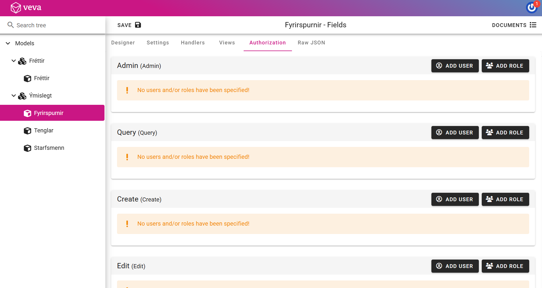 Til að efni birtist síðan á framenda þarf að tengja document uppsetninguna við framenda einingar. Það veltur á því hvernig uppsetningu á Veva þú ert með hvort þú getir útfært það á eigin spýtur eða hvort þú þurfi aðkomu forritara. En hver og ein mappa eða model getur haft sérstaka birtingarmynd.